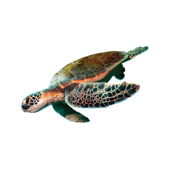 Green sea turtles are vegetarians that feed on seagrass and algae. Juveniles may also consume jellyfish, snails, crabs, and other invertebrates. At night green sea turtles sleep under reef ledges, returning to the surface periodically to breathe. During nesting season (April to October),they leave the water to lay around 100 eggs in a hole they dig on the beach.