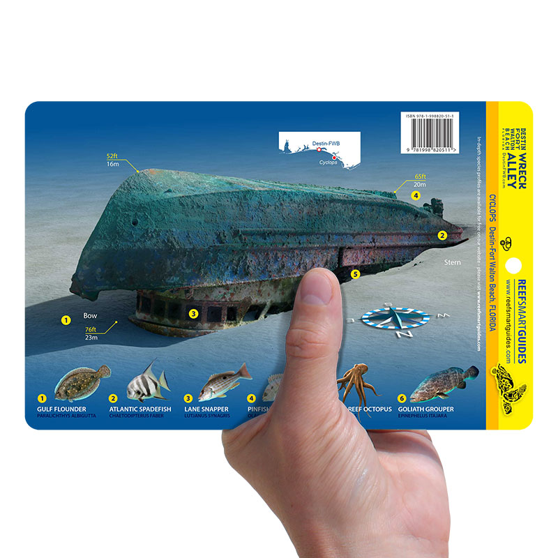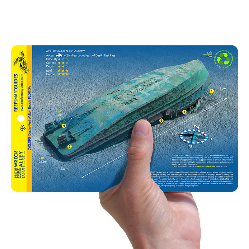 The RMS Cyclops was a 105-foot-long (32-meter) steel-hulled offshore supply vessel originally used in the oil and gas industry. She was deployed as an artificial reef on April 18, 2023 by Okaloosa County. The card features: