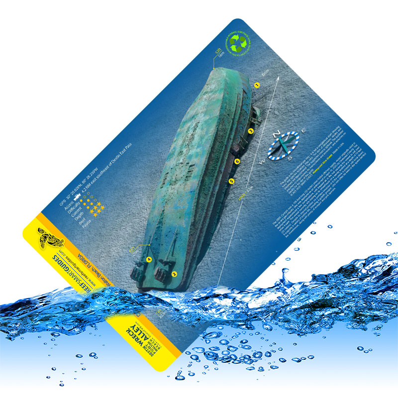 Exploring a new environment is an exhilarating experience. But there’s just so much to see and it can be hard to remember all the key information about a reef or wreck when you finally head into the water. Having that information readily available while in the water can improve safety and vastly improve your experience. Our waterproof cards are printed on plastic or laminated synthetic paper so that you can take them with you while you dive or swim. Each card includes valuable information such as: