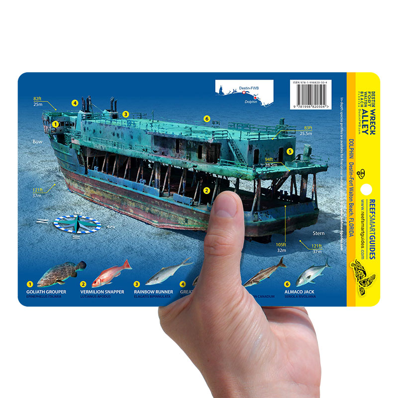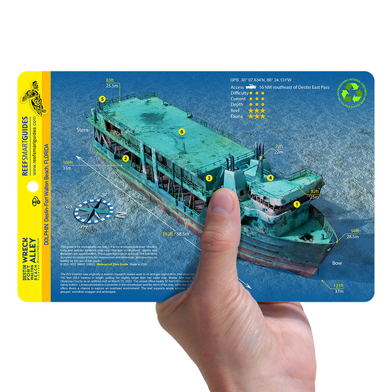 The R/V Dolphin was originally a seismic research vessel used in oil and gas exploration. The 192-foot (58.5-meter) vessel was deployed as an artificial reef in March 2023 by Okaloosa County. The card features: