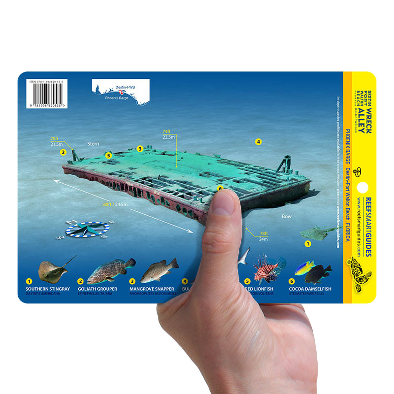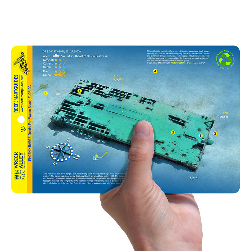 Also known as the “Lost Barge,” the 80-foot-long (24.5-meter) steel barge rests relatively intact at a depth of 78 feet (23.5 meters). The barge was deployed by Okaloosa County as an artificial reef in 1998. The card features: