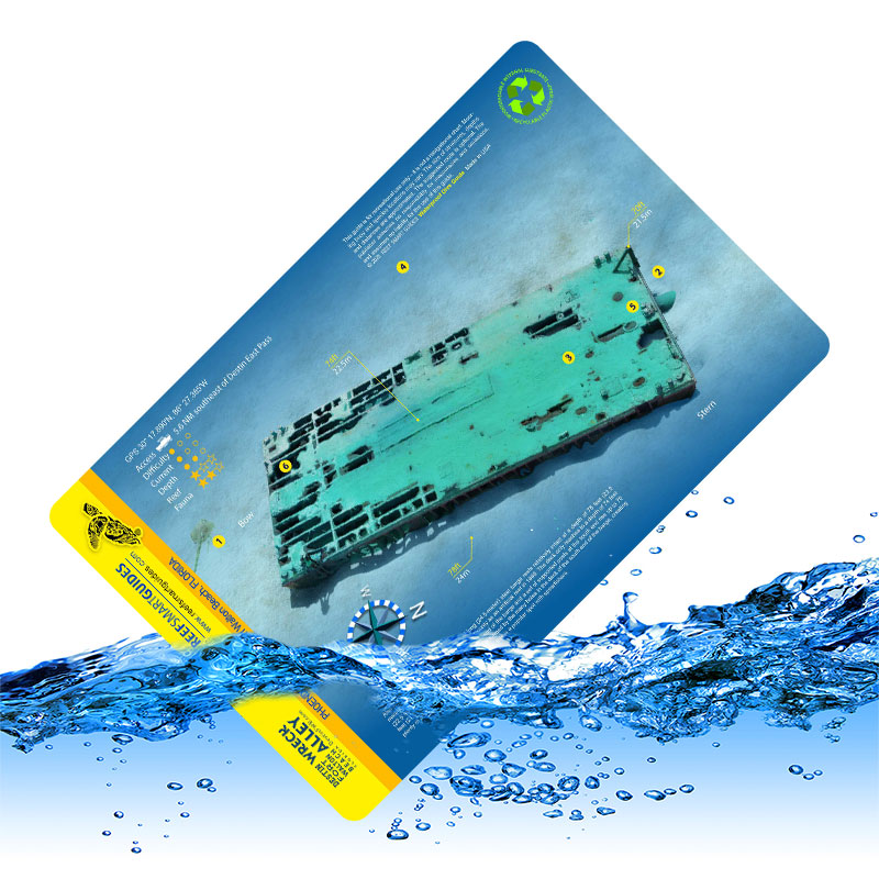 Exploring a new environment is an exhilarating experience. But there’s just so much to see and it can be hard to remember all the key information about a reef or wreck when you finally head into the water. Having that information readily available while in the water can improve safety and vastly improve your experience. Our waterproof cards are printed on plastic or laminated synthetic paper so that you can take them with you while you dive or swim. Each card includes valuable information such as: